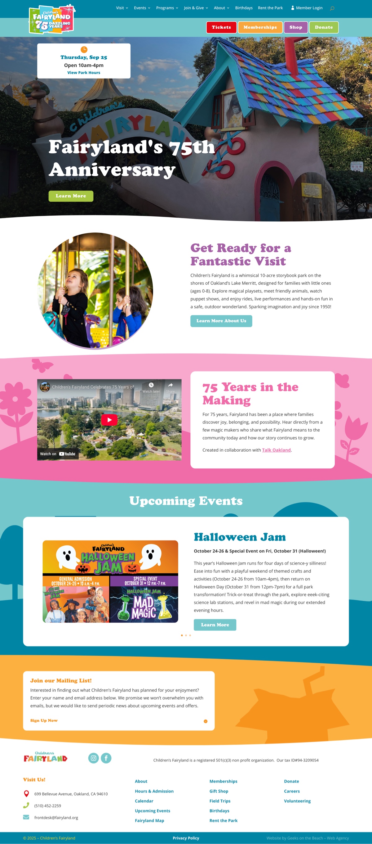 Fairyland needed a modern website that would serve families, educators, and supporters alike. The goal was to make it easy to plan a visit, learn about programs, support the organization, and feel the enchantment of Fairyland online. The site had to be joyful, informative, and mobile-friendly—capturing the charm of the park while offering practical functionality for parents and staff.